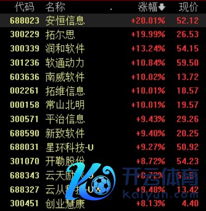 安恒信息、拓维信息、拓尔念念等多股涨停,润和软件、软通能源涨超10%,平治信息、新致软件、宝兰德等涨幅居前。